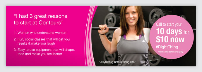 Contours are a nationwide chain of women’s gyms. This is a well established New Zealand brand and Sauvage Design refined it by simplifying the shapes to make it feel more contemporary. The existing colour scheme was retained to ensure it still resonated with it’s existing customers.